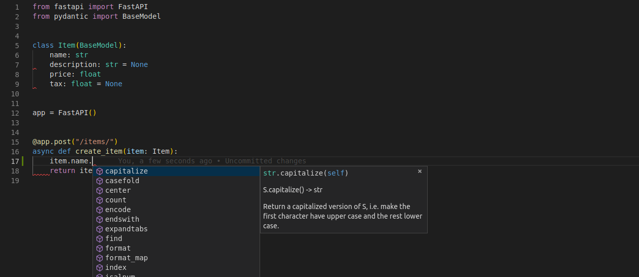 • Оскільки ви оголосили його у функції як тип Item, ви також матимете всю підтримку редактора (автозаповнення, тощо) для всіх атрибутів та їх типів.